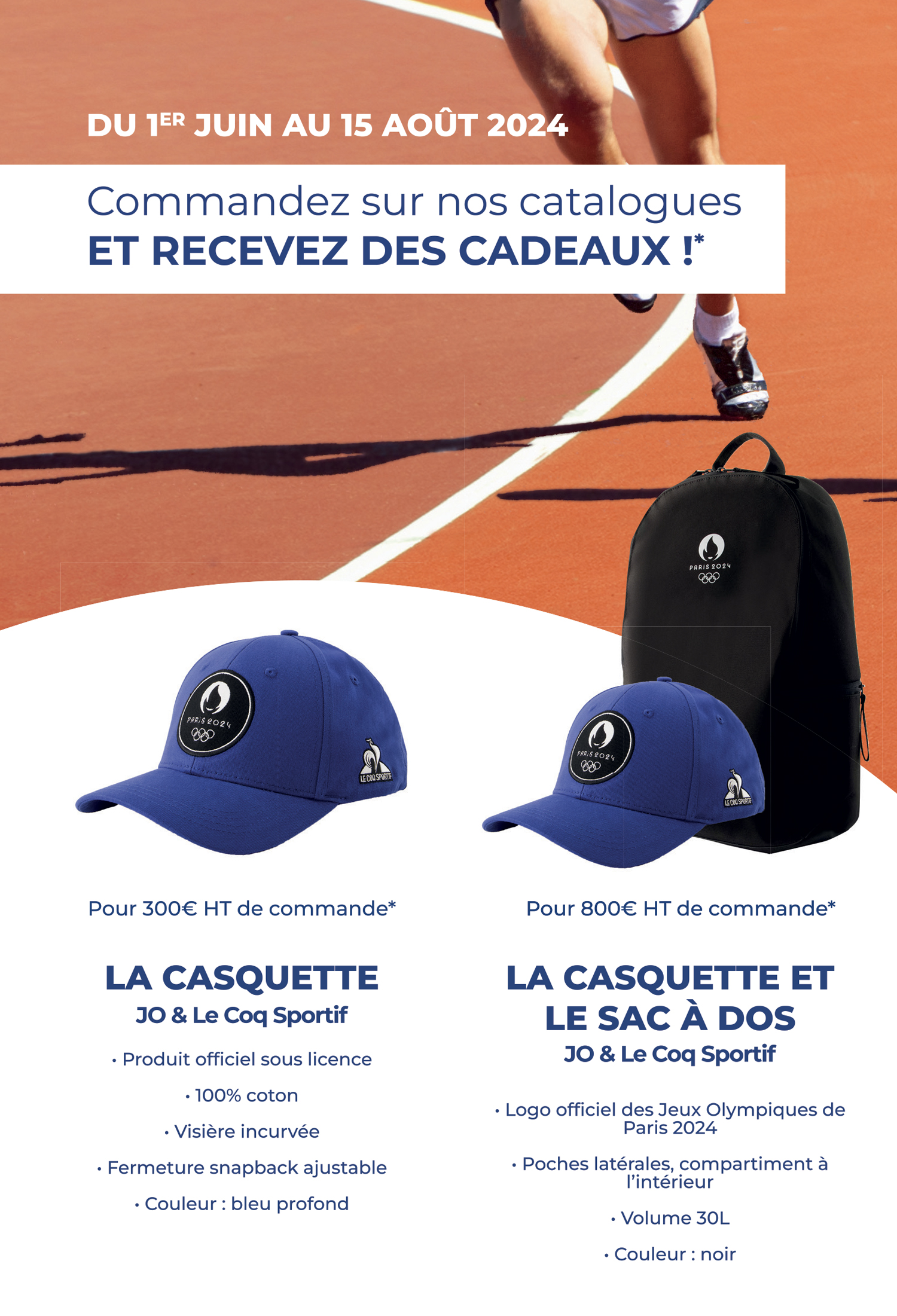 > 800€ HT : casquette officielle + sac à dos JO & Le Coq Sportif
